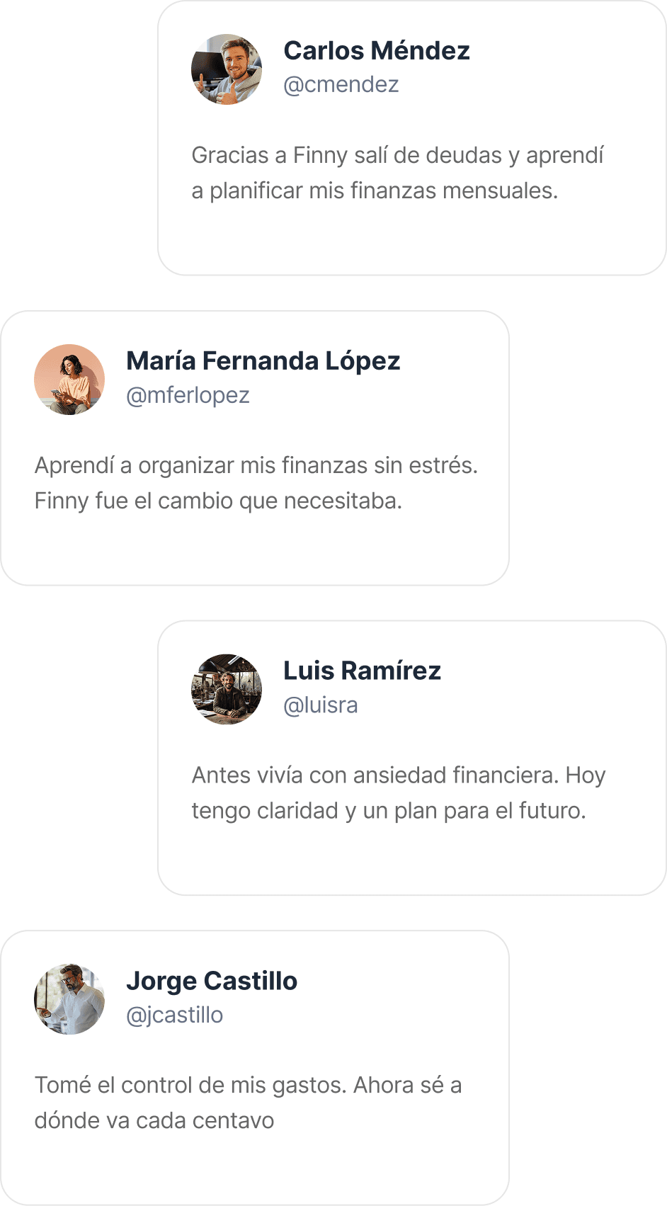 Personas como tú que llegaron a Finny buscando respuestas, y hoy viven con más claridad, tranquilidad y control sobre su dinero.
